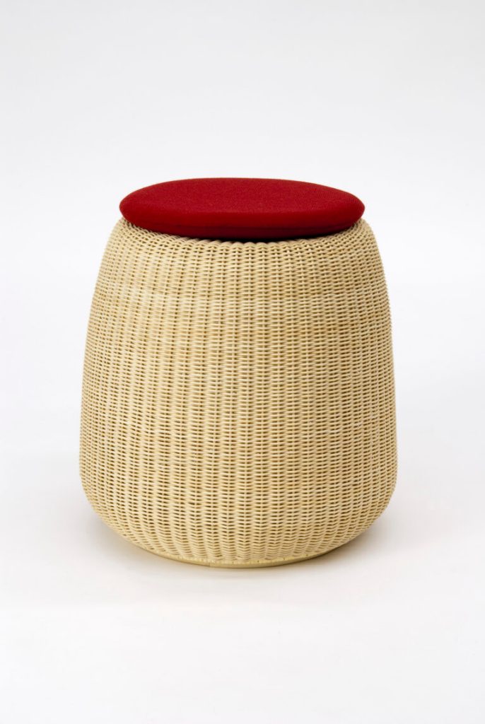 入ると、右手に真っ赤な壁のエントランスホールが目に入ってくる。ミルゾーの青と、青・灰色の空と、空の色を映す川の色を見ながら歩いてきているから、目の前に赤が広がると目が覚まされる。そこには等間隔に並べられたラタンスツール (1955年、剣持勇によるデザイン) がある。静謐で無駄のない雰囲気のなかに、日本らしいラタンのまるっこい温かみのある椅子があると、気を張らなくていいよ、と落ち着かせてくれる。意味もなく座ってみたりした。