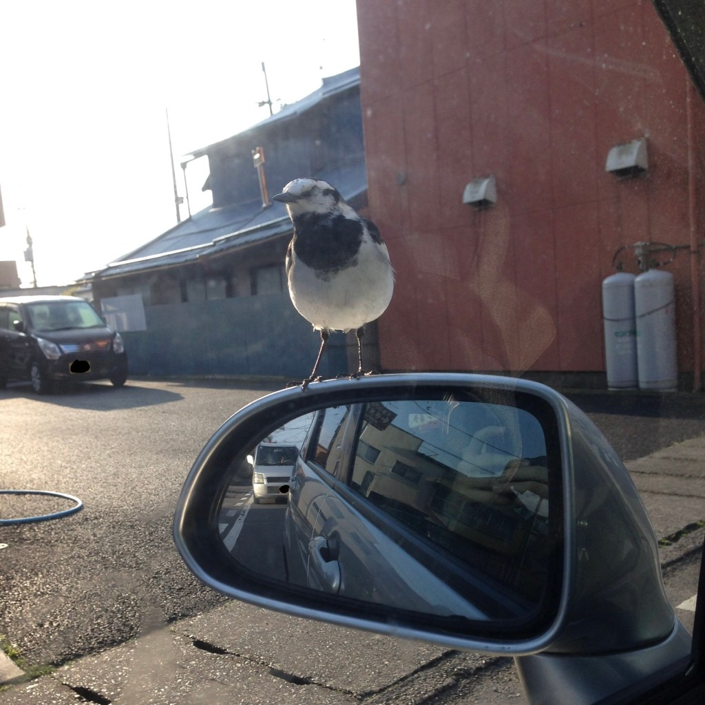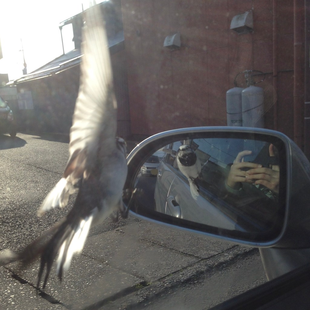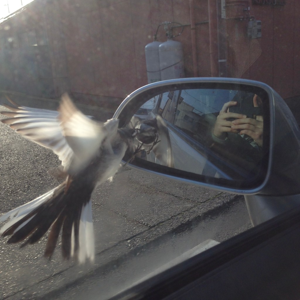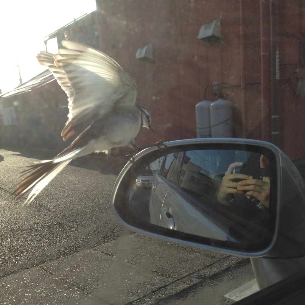 その日だけではありません。次の日もその次の日も、毎朝同じように、その鳥はサイドミラーの中の鳥を追い続けました。必ず、信号で一番前に停止する車のサイドミラーにいました。信号が赤のうちはスンと澄ましていた鳥が、青になった途端に急変して、必死の形相で鏡の自分に猛進するので、かわいいというよりは、ちょっと変な鳥でした。ある年の春の、ある数週間ほどの出来事でした。