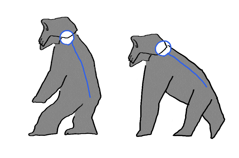 私たち人類は四つん這いになるとき、顔を地面のほうに向かせているのが一番楽である。これは、大後頭孔が頭蓋骨のほぼ中央にあるからだ。無理やり前を向こうとするとき、余計な筋肉を使うから、肩が凝るのである。一方、ダックスフンドやチンパンジーの大後頭孔は、頭蓋骨の後ろのほうにある。これなら肩凝りに悩まされることもなく、四つん這いの状態で前を向くことができる。こういった頭蓋骨を持つ動物は、四足歩行を基本としているとわかる。