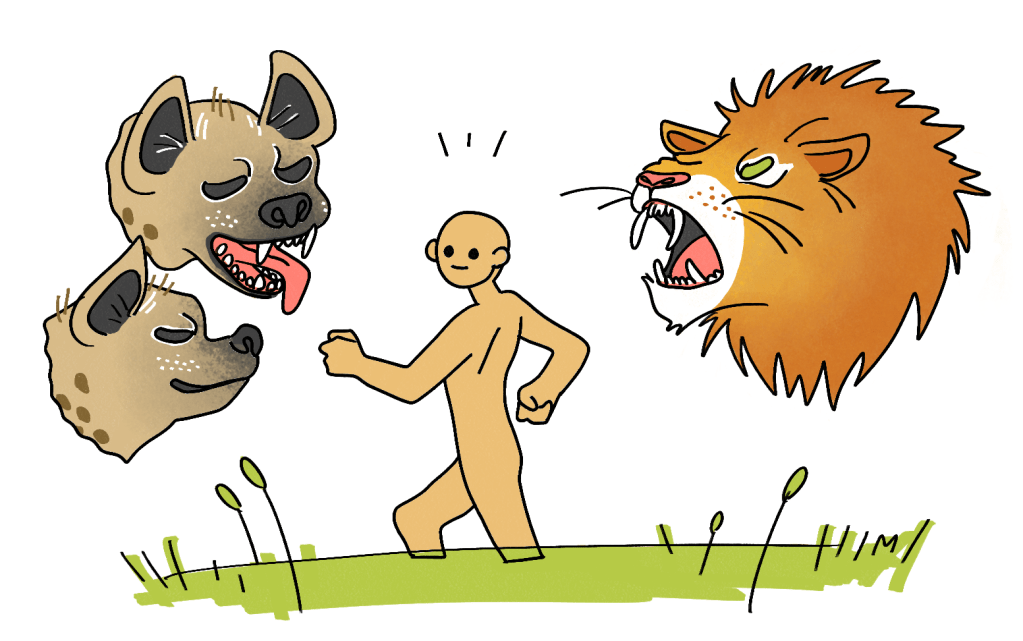 他の動物たちが移動方法として直立二足歩行を選択しなかったことには理由がある。直立二足歩行には、いくつかの欠点があるのだ。まず、立っているから目立つ。草原なんかを歩いていたら、肉食獣に簡単に見つかってしまう。そして走るのが遅い。人類が走って獣から逃げることは不可能だ。すぐに捕まってしまう。草原で肉食獣と勝負をしたら、人類に勝ち目はない。人類は、とても弱い生き物なのだ。